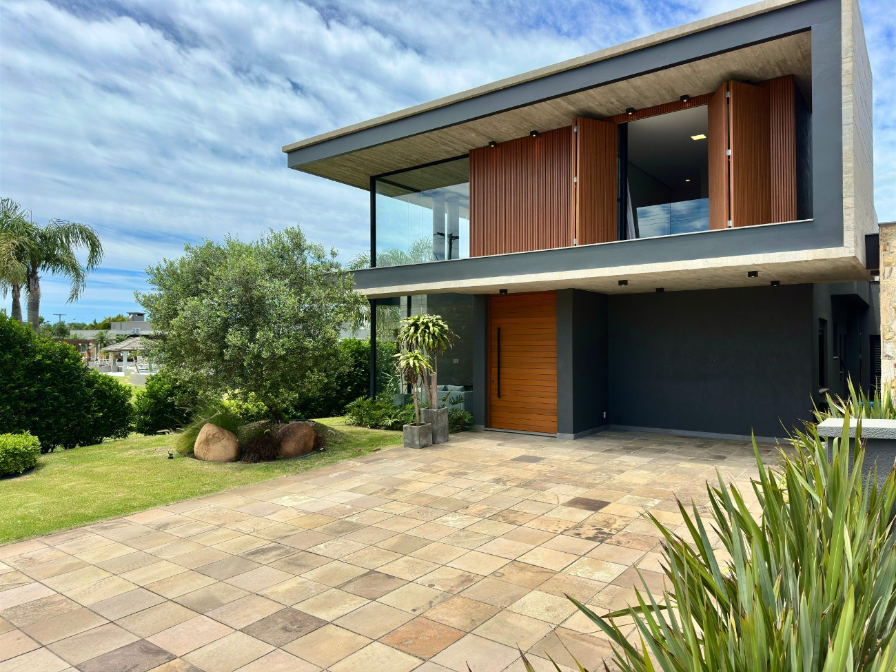 • Revestida com pedras naturais e brises de louro freijó,