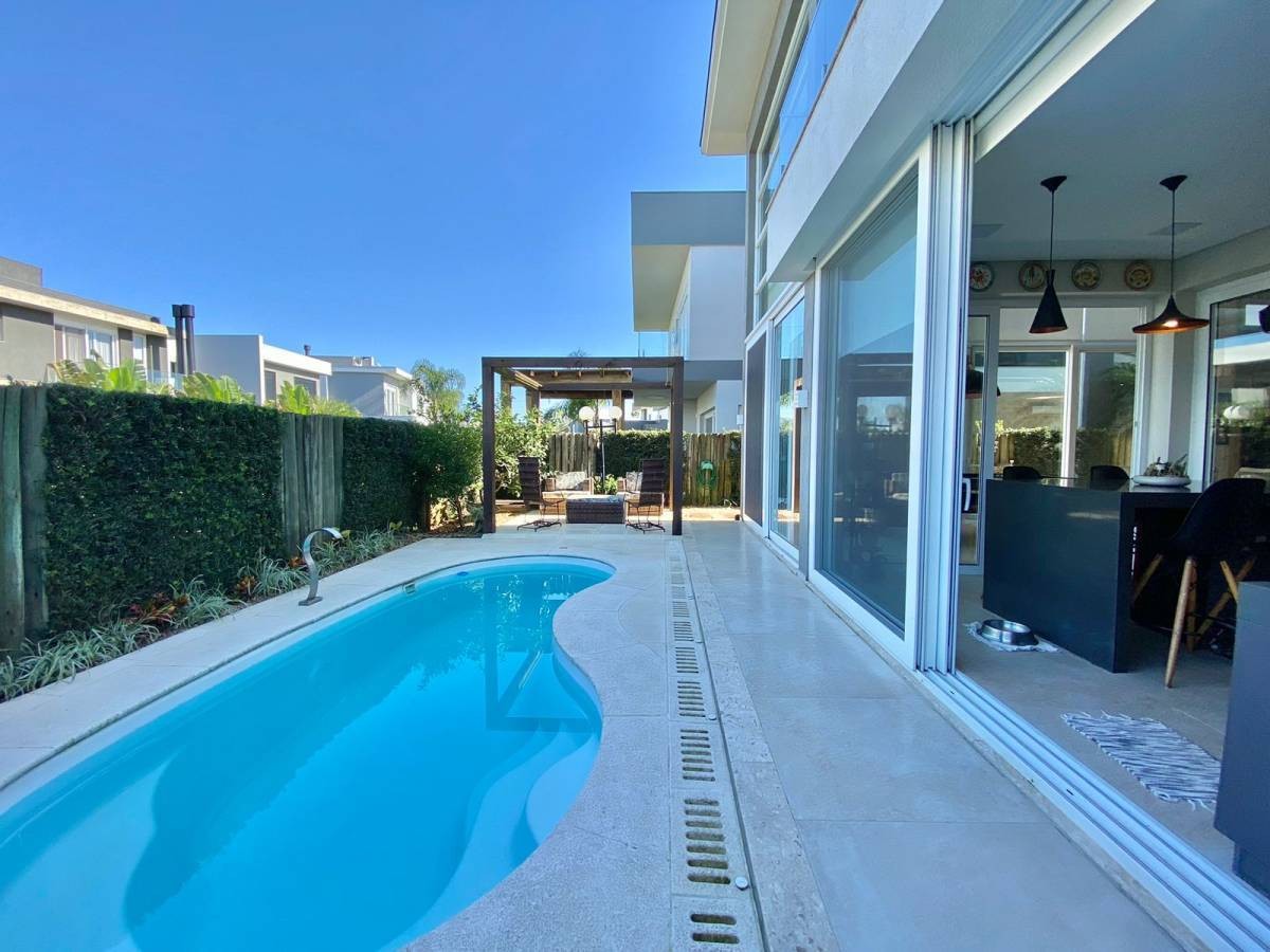 Casa de Luxo no Condomínio Capão Ilhas Resort! Apresentamos uma magnífica residência no prestigiado condomínio Capão Ilhas Resort, perfeita para quem busca conforto e sofisticação. A casa possui cinco dormitórios, sendo quatro suítes espaçosas, incluindo uma no térreo. O living oferece quatro ambientes amplos e versáteis para receber amigos e familiares. O espaço gourmet é completo, com churrasqueira, mesa de bilhar e acesso direto à piscina privativa. A lavanderia é separada, garantindo organização no dia a dia. Há também um lavabo moderno para maior comodidade. A casa conta ainda com energia solar fotovoltaica, piso aquecido em toda casa e um sistema de aspiração central, com algumas tomadas distribuídas pela casa, facilitando a limpeza em qualquer ambiente, inclusive, há uma tomada externa para aspirar os carros, oferecendo ainda mais praticidade. A fachada da casa é moderna e imponente, destacando-se no condomínio. Localização privilegiada próxima ao clube e à área verde. O condomínio, à beira da lagoa, oferece beleza natural e tranquilidade. Infraestrutura completa com piscinas, quadras, salão de festas, academia e segurança 24 horas para garantir diversão e bem-estar para toda a família. Não perca essa oportunidade! Entre em contato e venha conhecer este incrível imóvel.